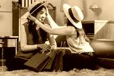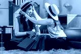 Two young women sitting on a cozy rug, trying on hats and sharing smiles. Surrounded by colorful shopping bags, they enjoy each other's company in a warm, sunlit room