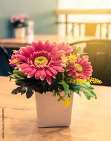 Bouquet of beautiful artificial flowers on wooden table in a cof