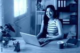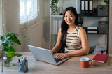 A beautiful Asian businesswoman works on her laptop at her desk in the office, smiling at the camera