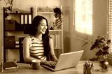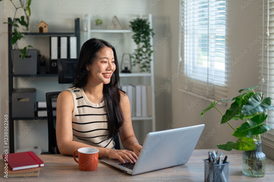 A beautiful Asian businesswoman is daydreaming about her career success while working in her office.