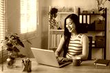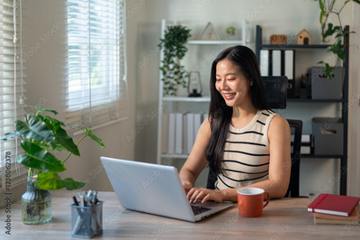 An attractive Asian businesswoman in casual clothes is working on her laptop in her office.