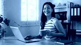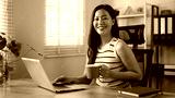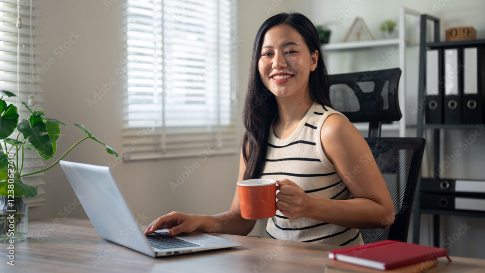A businesswoman sits at her desk in the office, holding a coffee mug and smiling at the camera.