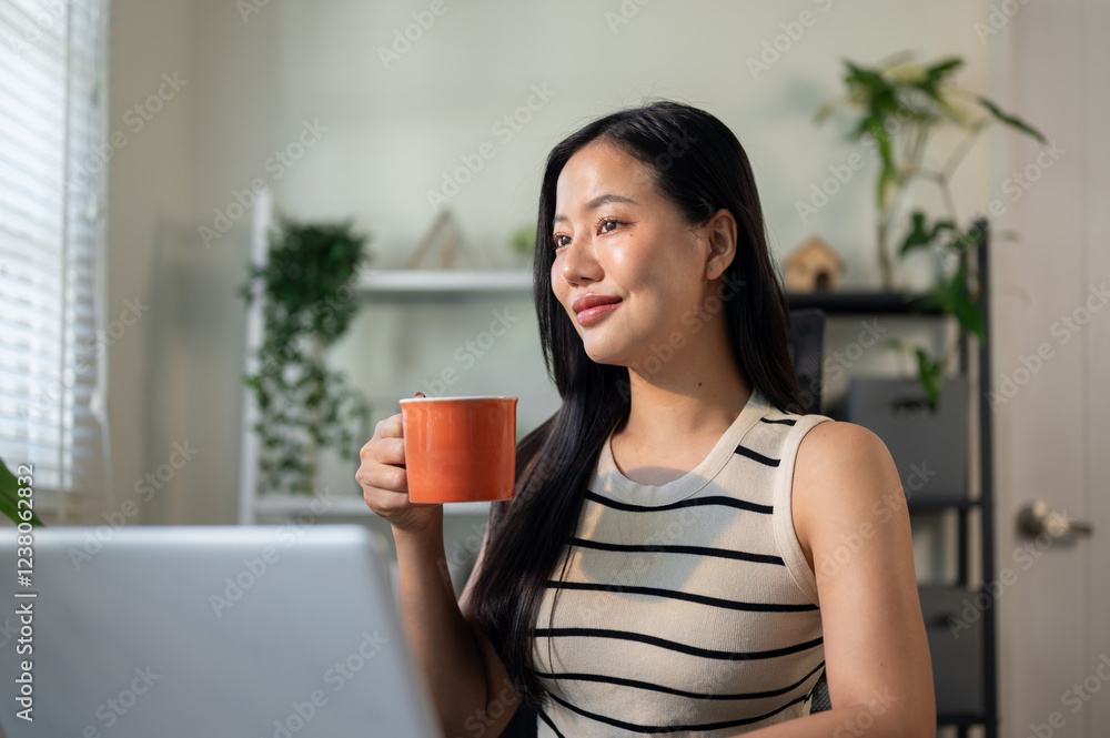 A satisfied Asian businesswoman is daydreaming while enjoying a morning coffee at her desk.
