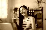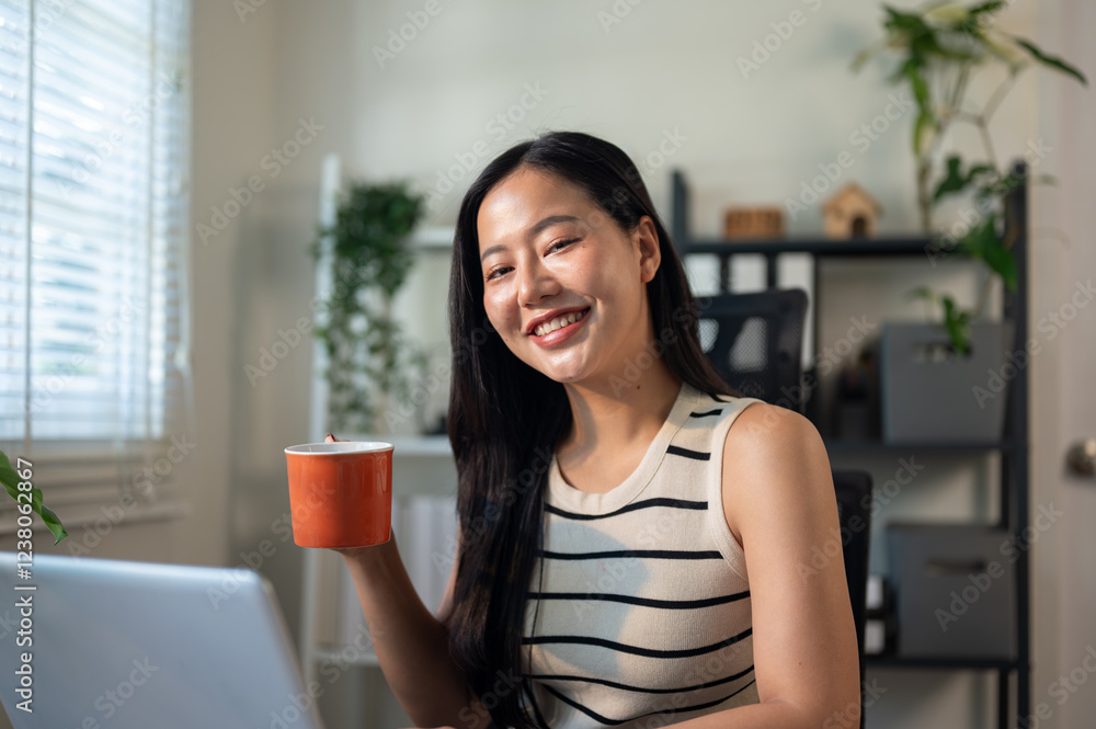 A beautiful Asian businesswoman is in the office, holding a coffee mug and smiling at the camera.