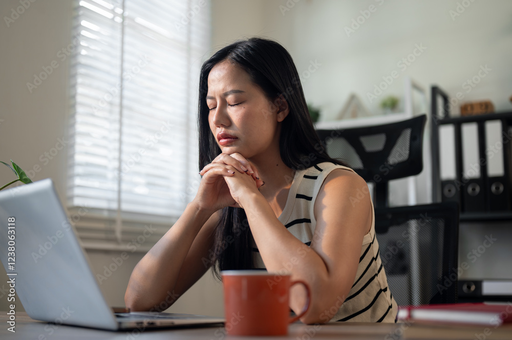 A stressed Asian businesswoman is sitting in front of a laptop at her desk with her eyes closed.