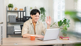 A positive Asian businessman waving to greet his colleagues through an online meeting via his laptop