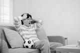 A shocked Asian man is watching his favorite football team lose to another team on TV at home.