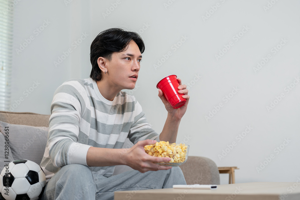 An excited Asian man, focused on his favorite football team's match on TV, sitting on the sofa.