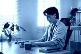 A handsome, smart Asian businessman is working on his laptop at a desk in his minimalist office.