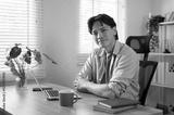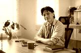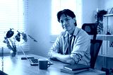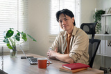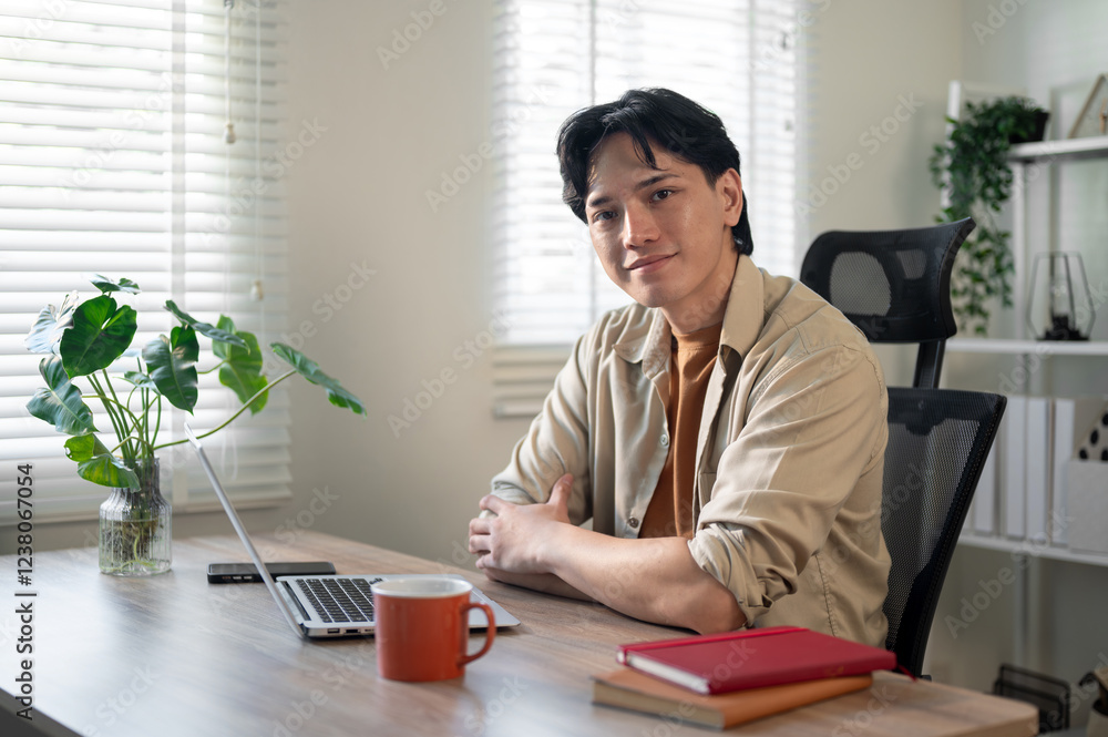 A handsome Asian businessman is sitting in front of a laptop at his desk, smiling at the camera.