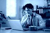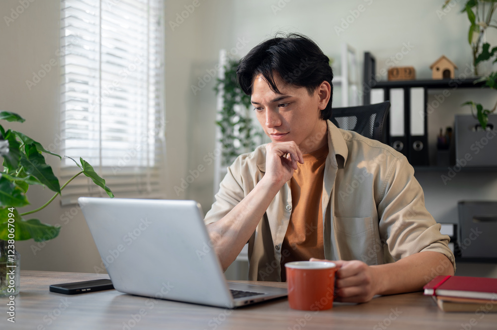 A handsome, smart Asian businessman is working on his laptop at a desk in his minimalist office.