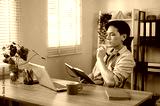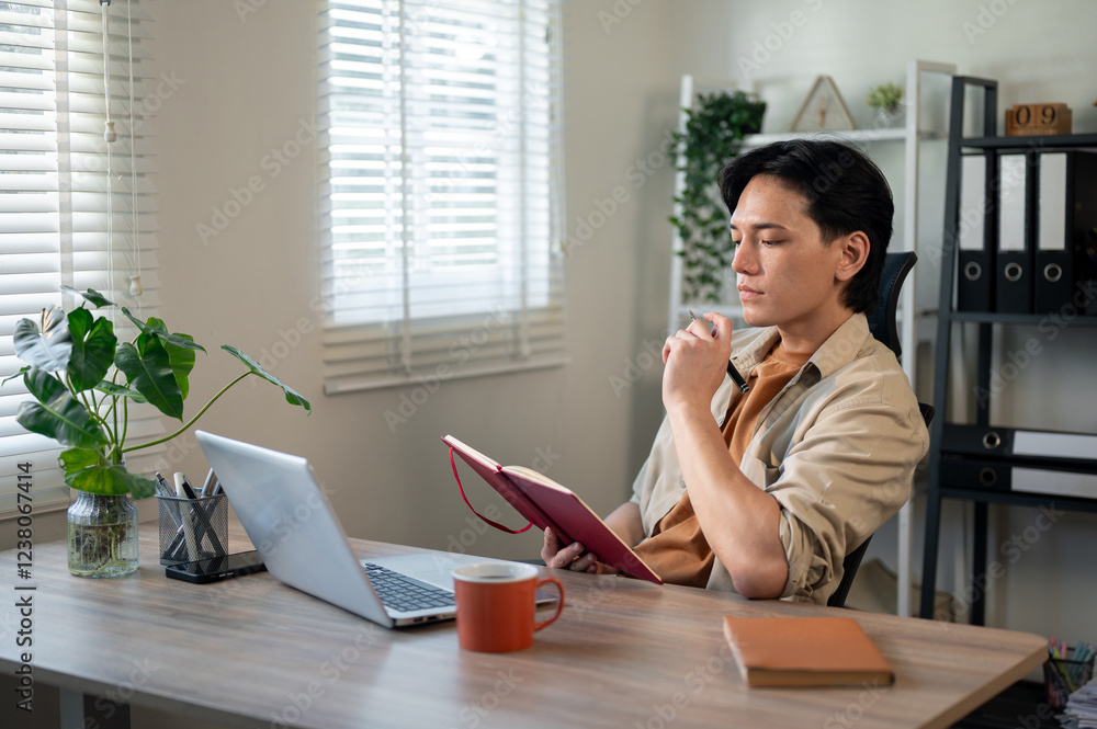 A focused, smart Asian businessman is contemplating his work ideas and writing them in a book.