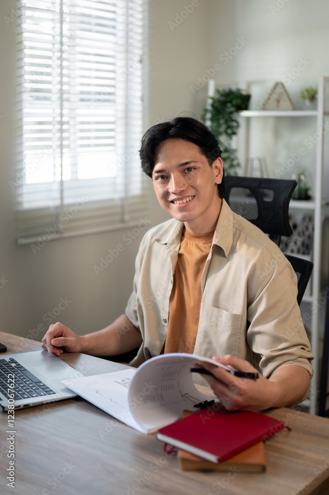 Smiling, satisfied Asian businessman is sitting at his desk in his office and smiling at the camera.