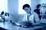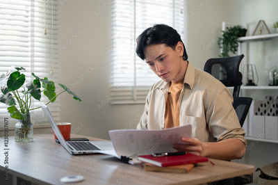 A focused Asian businessman is reviewing a business report at his desk in the office.