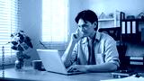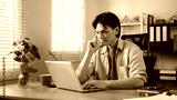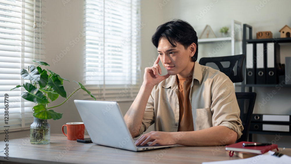 A handsome, smart Asian businessman is working on his laptop at a desk in his minimalist office.