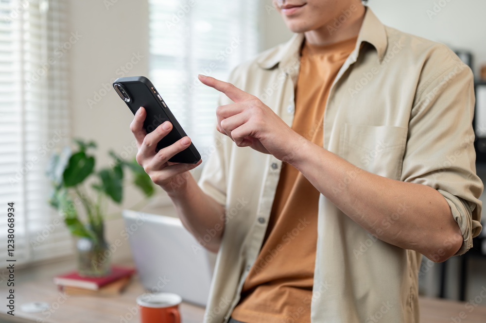A close-up of a positive Asian man standing in his office, using his smartphone to text someone.