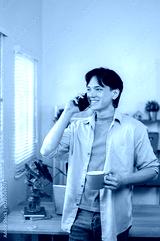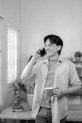 A smiling Asian businessman stands in his office, gazing out the window while talking on the phone.