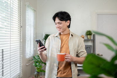 A handsome Asian businessman smiles at messages on his smartphone while standing in his office.