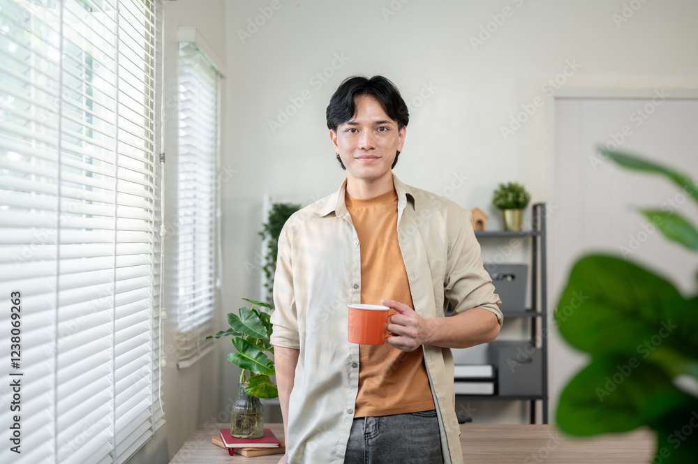 A happy Asian businessman is standing with a coffee cup in his hand, smiling at the camera.