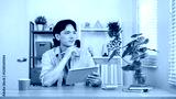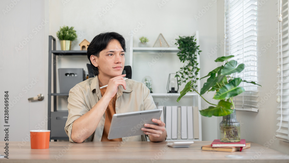 A positive man sits at his desk with his tablet, contemplating his work while gazing out the window.