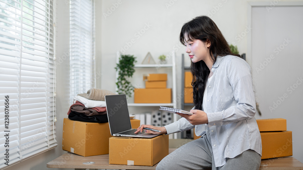 A focused Asian female entrepreneur is at her desk, working on her laptop, checking stock items.