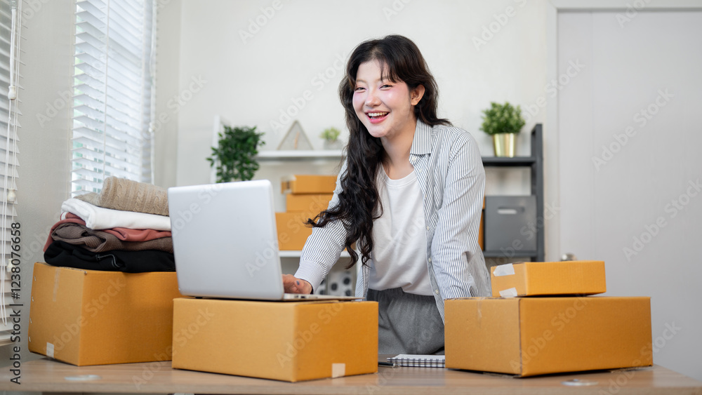 A smiling, happy Asian female online business entrepreneur is at her desk, working on her laptop.