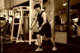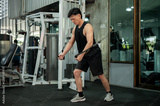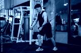 A serious, muscular Asian male athlete is using a cable machine in the gym.