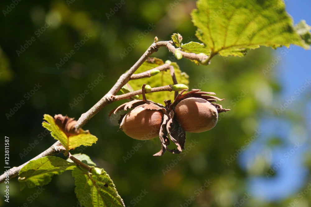 Nocciole su ramo in autunno, con cielo blu