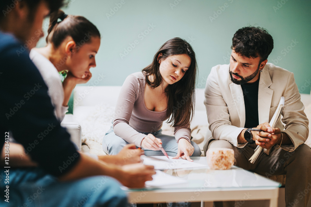 A group of high school students engaged in a school project with a professor, creating a focused and interactive learning environment in a cozy home setting.