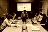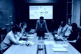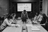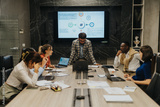 Diverse group of business people focused on a late-night work meeting. They are gathered around a table, using laptops, discussing strategies with determination and teamwork in a modern office setting