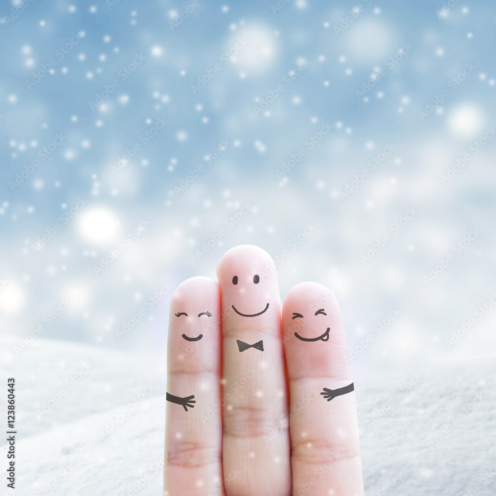 Happy finger art family group of loving mother and father with son while smiley face at blurred winter background with falling snowflakes, copy space.