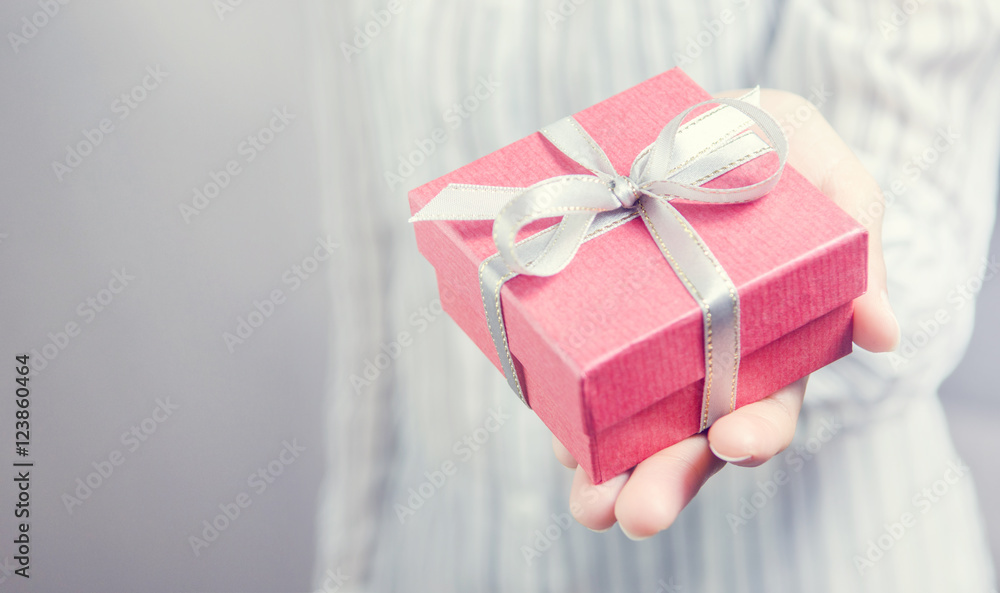 Closeup, Woman hand holding red gift box, female giving gift, New year holidays and greeting season concept, copy space.