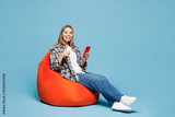 Full body young woman she wears checkered grey shirt casual clothes sit in bag chair hold in hand use mobile cell phone show thumb up isolated on plain pastel blue background studio Lifestyle concept