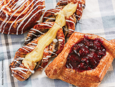 pastries, buns, custard cake, a glass of milk on the table. Close-up