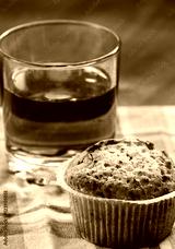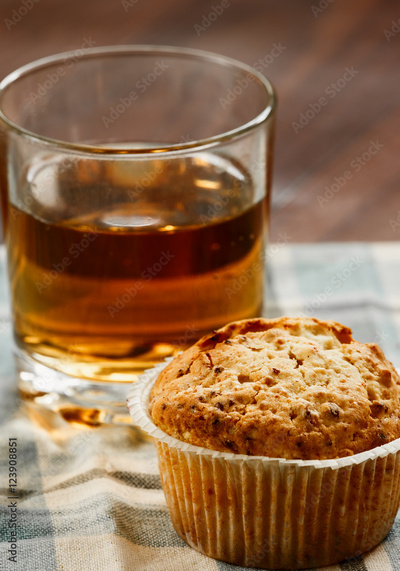 pastry, one muffin, a glass of apple juice on the table. Close-up