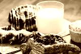 pastries, buns, custard cake, a glass of milk on the table. Close-up