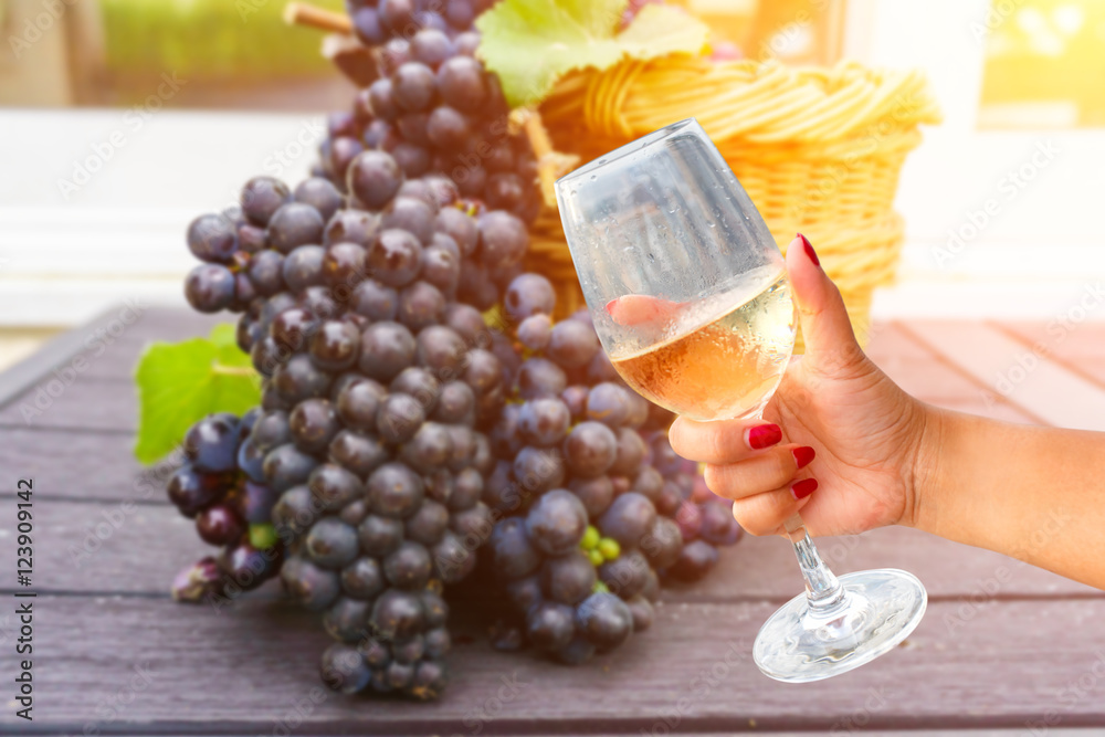 Woman holding a wine glass on vine grapes in champagne on wood background, France