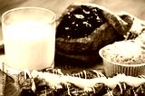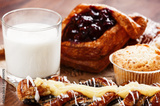 pastries, buns, custard cake, a glass of milk on the table. Close-up