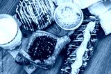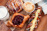 pastries, buns, custard cake, a glass of milk on the table. Close-up