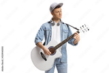 Guy playing a white acoustic guitar