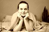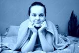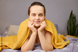 A woman is lounging on her bed, wrapped in a warm yellow blanket. She looks content, resting her chin on her hands and gazing comfortably at the viewer, surrounded by a calm interior