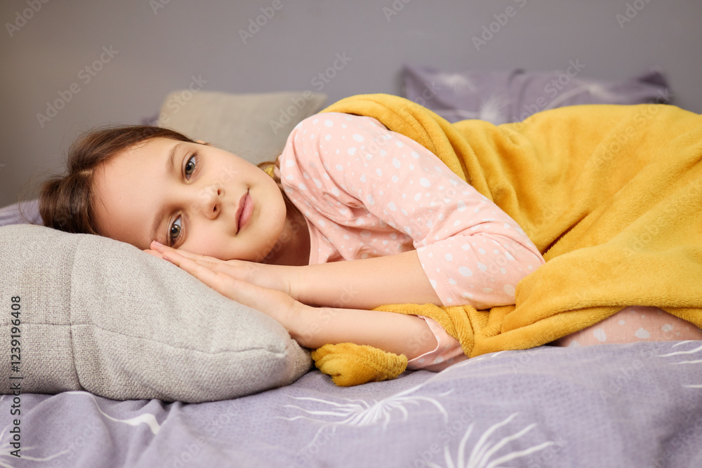 A young girl lies on a soft bed, her face resting on her hands. She is wrapped in a warm yellow blanket, looking thoughtful and serene in a cozy bedroom during the afternoon