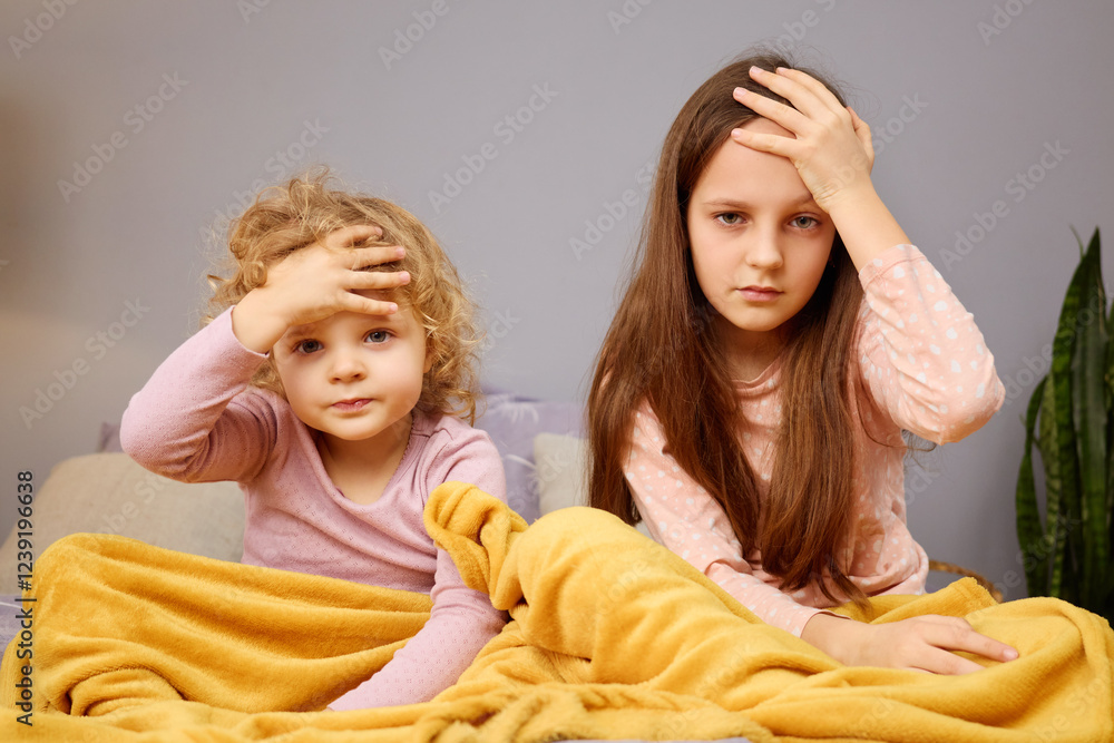Two sisters are resting on a couch, wrapped in yellow blankets. One girl appears to have curly hair, while the other has long straight hair, both showing signs of discomfort
