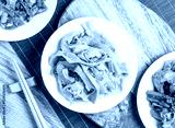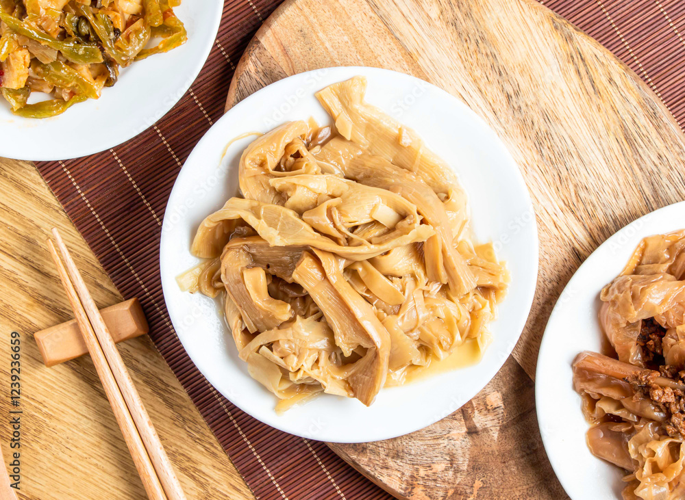 braised bamboo shoots served in plate with chopsticks and spoon isolated on wooden board top view of taiwan food