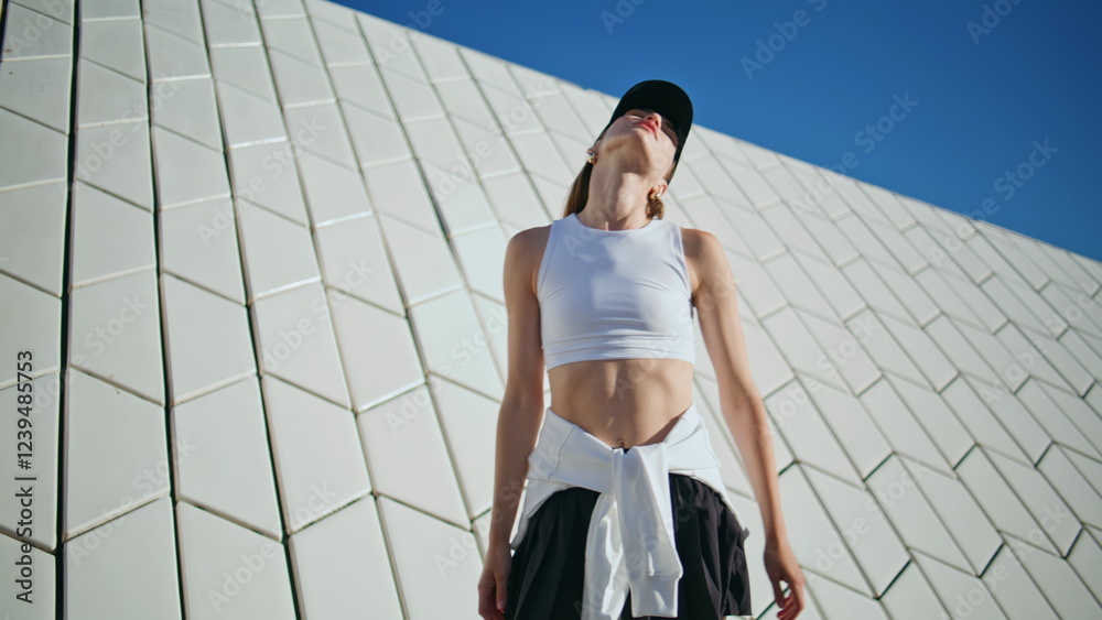 Sport girl stretching neck enjoying summer sunlight at urban architecture.