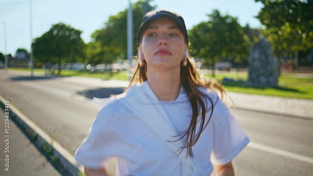 Motivated girl running pathway wearing wireless earbuds closeup. Active runner