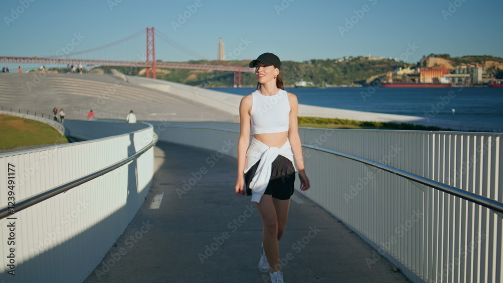 Sporty lady walking urban bridge at serene summer morning. Calm woman strolling