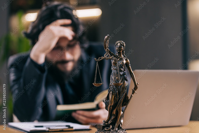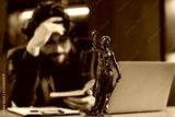 A tired male lawyer working late into the night in a modern office. Concept: legal services, continuous work, and dedication to achieving results.