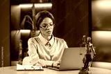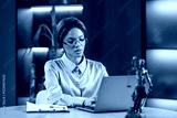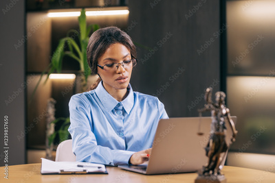 A businesswoman lawyer of African descent working on a laptop with a statue of Lady Justice on her desk. Concept: modern legal practices with a focus on justice and precision.