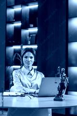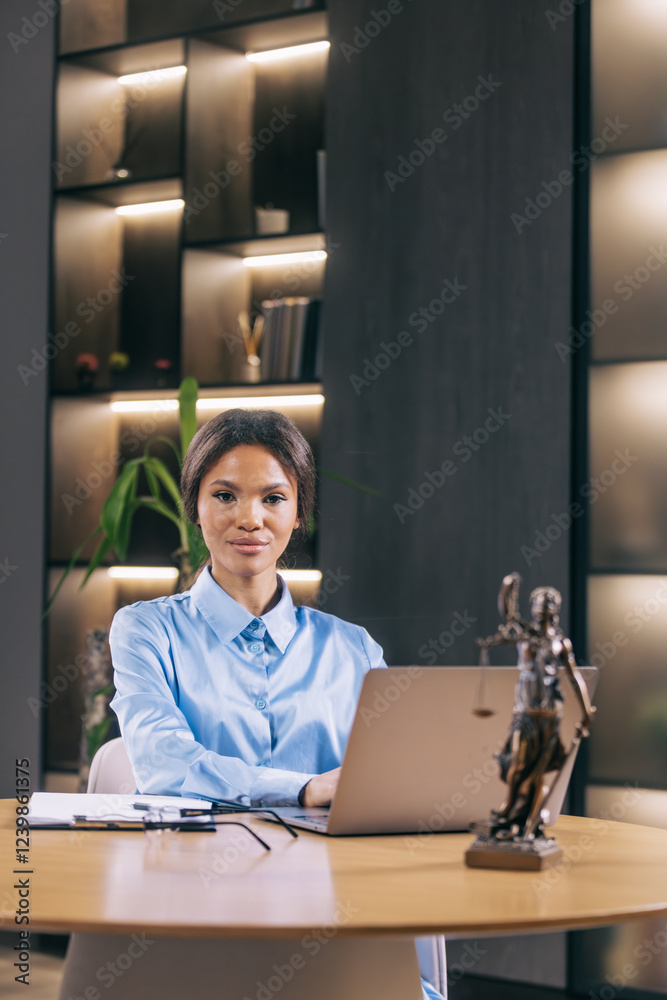 A businesswoman lawyer of African descent working on a laptop with a statue of Lady Justice on her desk. Concept: modern legal practices with a focus on justice and precision.